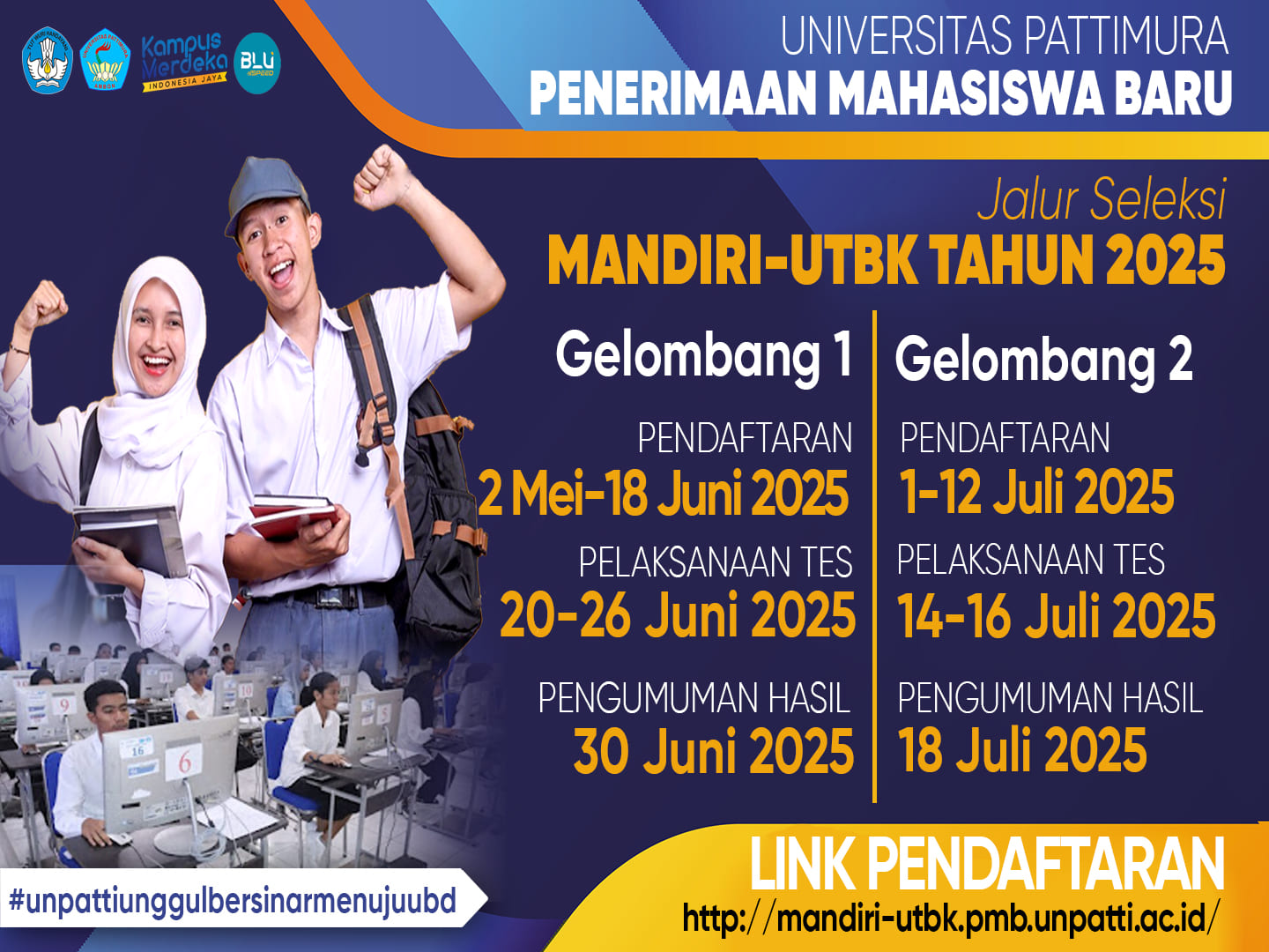 Seleksi Mandiri Jalur Tes merupakan seleksi masuk perguruan tinggi yang dilakukan berdasarkan hasil Ujian Tulis Berbasis Komputer (UTBK) dan dapat ditambah dengan kriteria lain sesuai dengan ketentuan yang ditetapkan Universitas Pattimura. Seleksi diperuntukkan bagi calon mahasiswa Lulusan SMA/MA/SMK/Sederajat tahun 2023, 2024 dan 2025 atau peserta didik Paket C tahun 2025 dengan maksimal umur 25 Tahun untuk program Reguler atau bagi calon mahasiswa Lulusan SMA/MA/SMK/Sederajat di atas 3 tahun terakhir/sementara bekerja untuk program Non Reguler, melalui Ujian Tulis Berbasis Komputer (UTBK).